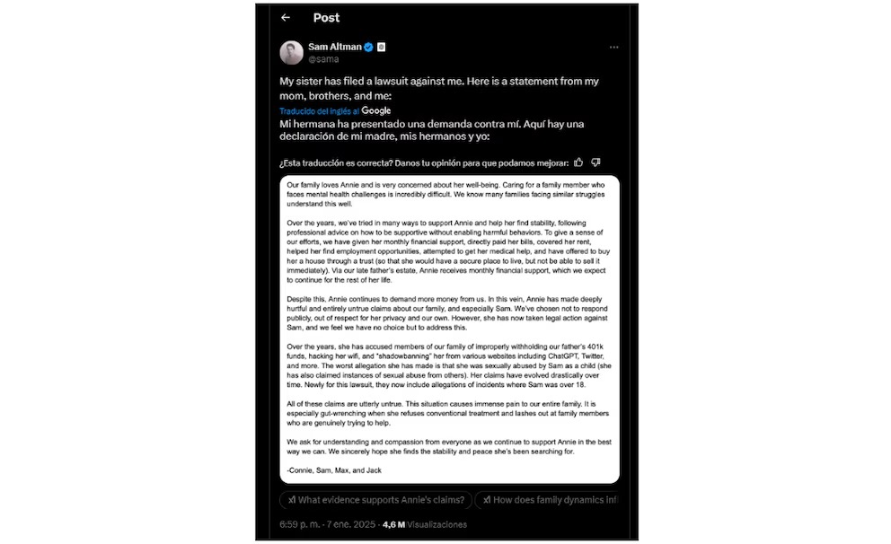 En respuesta, Sam Altman negó las acusaciones a través de un comunicado publicado en su cuenta de X (antes Twitter), el cual fue firmado por él y otros miembros de su familia. “Todas estas afirmaciones son completamente falsas. Esta situación causa un inmenso dolor a toda nuestra familia”, declaró.