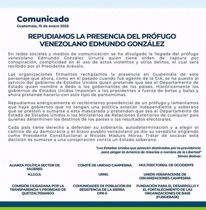 Peña explicó que "movimientos sociales, campesinos, mujeres, partidos políticos, pueblos originarios guatemaltecos han manifestado su firme repudio a la presencia del fascismo en su país, representado por la figuro inmunda de Edmundo González".