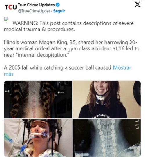 Internacional.- Megan King, una mujer del estado de Illinois (EE.UU.), ha revelado en exclusiva al diario Daily Mail cómo una simple caída mientras practicaba deporte la dejó al borde de la decapitación interna y le hizo la vida imposible durante muchos años.