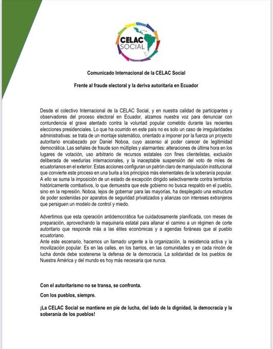 La CELAC Social advirtió que este escenario es el resultado de una operación antidemocrática planificada durante meses, aprovechando la maquinaria estatal para favorecer un régimen autoritario alineado con élites económicas y agendas foráneas, en detrimento del pueblo ecuatoriano. En respuesta, el colectivo hizo un llamado urgente a la organización, la resistencia activa y la movilización popular, instando a defender la democracia en las calles, barrios y comunidades.