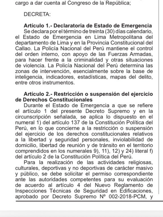 "Hoy empezamos a cambiar la historia en la lucha contra la inseguridad en el Perú", manifestó el mandatario en un mensaje a la Nación, explicando que la medida "presenta un nuevo enfoque: pasamos de la defensiva a la ofensiva en la lucha contra el crimen" que confió permitirá al Gobierno "recuperar la paz, la tranquilidad y la confianza" de la población.