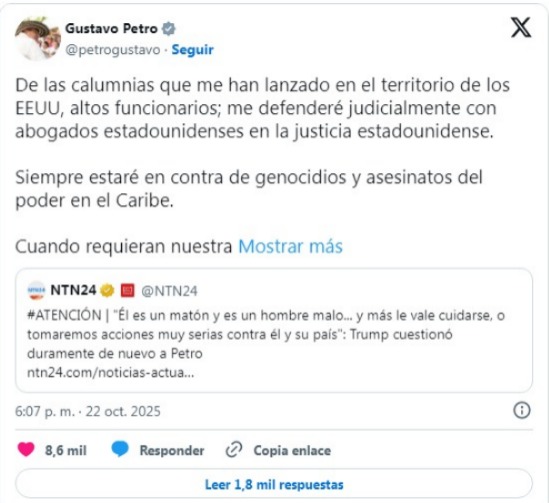 Internacional.- El presidente de Colombia, Gustavo Petro, ha reaccionado este miércoles a una nueva arremetida de su homólogo estadounidense, Donald Trump. Minutos después de que el norteamericano lo señalara de ser “un matón y “una mala persona”. El mandatario ha anunciado que se defenderá de “las calumnias” en la justicia estadounidense.