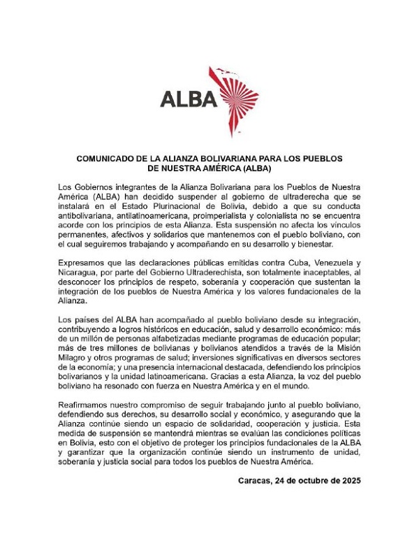 "Esta suspensión no afecta los vínculos permanentes, afectivos y solidarios que mantenemos con el pueblo boliviano, con el cual seguiremos trabajando y acompañando en su desarrollo y bienestar", precisó la alianza, conformada por Venezuela, Cuba, Nicaragua, Dominica, Antigua y Barbuda, San Vicente y las Granadinas, San Cristóbal y Nieves, Granada, Santa Lucía y Bolivia, ahora suspendida.