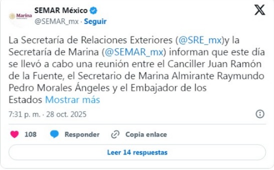 El martes por la noche, el gobierno mexicano detalló que el encuentro con el diplomático había sido presidido por el canciller Juan Ramón de la Fuente y el Secretario de Marina Almirante, Raymundo Pedro Morales Ángeles, por órdenes de la mandataria Claudia Sheinbaum, para "fortalecer la cooperación bilateral" en materia marítima.