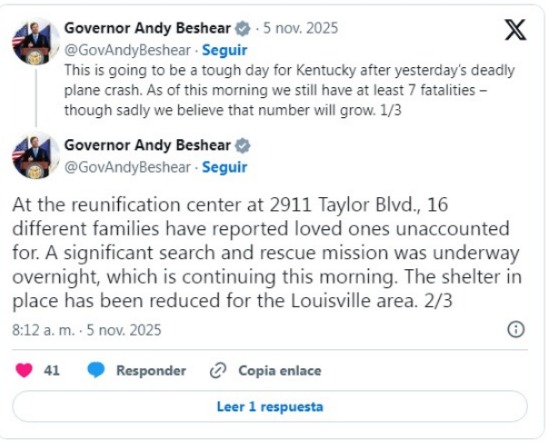 "Las noticias desde Louisville son duras esta noche, ya que el número de muertos ha alcanzado al menos siete, y se espera que esa cifra aumente", escribió en X el gobernador de Kentucky, Andy Beshear.