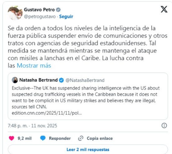 El presidente colombiano realizó el anuncio reposteando una noticia que informaba de que el Reino Unido suspendía el envío de comunicaciones de inteligencia con EE.UU. sobre presuntas embarcaciones narcotraficantes en el Caribe para no tener relación con unas operaciones que considera ilegales.