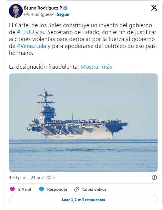 El ministro de Relaciones Exteriores de Venezuela, Yván Gil, agradeció el pronunciamiento de su par cubano: "Agradecemos profundamente su valiente denuncia ante la más reciente patraña del Gobierno de EE.UU., que busca justificar agresiones contra la Patria de Bolívar en su desesperado intento por implementar la Doctrina Monroe 2.0".