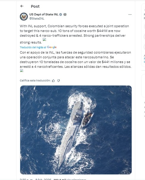 "Las fuerzas colombianas de seguridad ejecutaron una operación conjunta para atacar este narcosubmarino", inidicó el organismo en la red social X. "Las alianzas sólidas dan resultados contundentes", agregó.