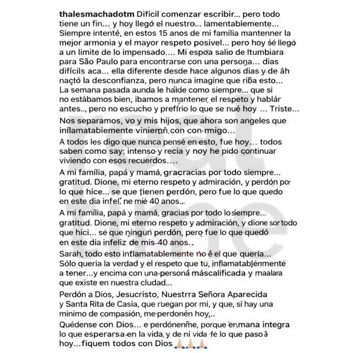 Y, acto seguido, habría explicado la situación de su matrimonio: "Mi esposa salió de Itumbiara hacia Sao Paulo para encontrarse con una persona… fueron días difíciles aquí. Ella estuvo distinta desde hace algunos días y de ahí nació la desconfianza, pero nunca imaginé que esto llegaría a este punto. (...) Nos separamos: yo y mis hijos, que ahora son ángeles que, inevitablemente, vienen conmigo".