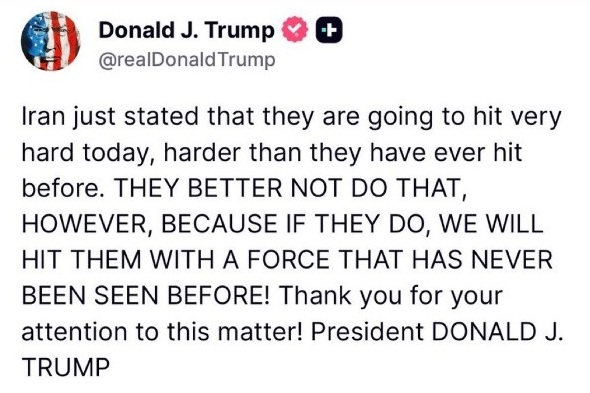 En un post publicado en la red social Truth, el presidente de EE.UU. respondió a las amenazas del régimen iraní. “Irán acaba de declarar que hoy va a golpear muy fuerte, más fuerte que nunca”, escribió. “Pero mejor que no lo hagan, porque si lo hacen, ¡les golpearemos con una fuerza nunca antes vista!”.