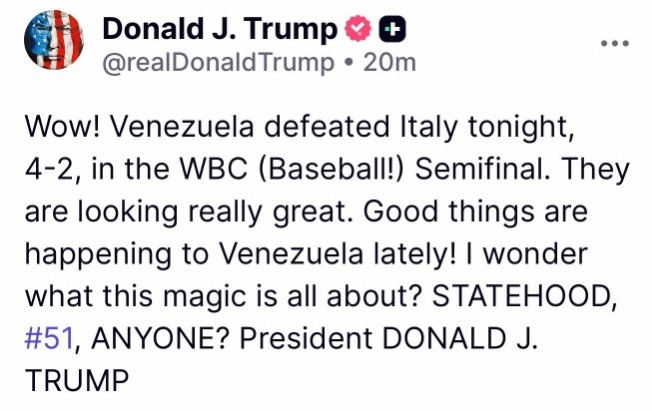 A través de su cuenta oficial en la red social Truth Social, el mandatario estadounidense elogió el desempeño de la novena venezolana. "¡Vaya! Venezuela derrotó a Italia esta noche, 4-2, en la semifinal del Clásico Mundial (¡Béisbol!). Están jugando realmente muy bien. Últimamente le están pasando cosas buenas a Venezuela".