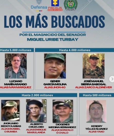 Internacional.- Las autoridades colombianas ordenaron este lunes la captura de siete jefes de la Segunda Marquetalia, la disidencia de las FARC que lidera alias Iván Márquez, por su implicación en el magnicidio del senador y precandidato presidencial Miguel Uribe Turbay, perpetrado a mediados del año pasado en Bogotá.