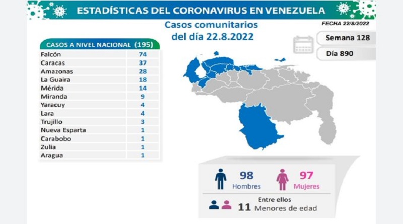 Igualmente, informó que los casos comunitarios están ubicados en los estados: Falcón 74, Caracas 37, Amazonas 28, La Guaira 18, Mérida 14, entre otros que se describen a continuación: