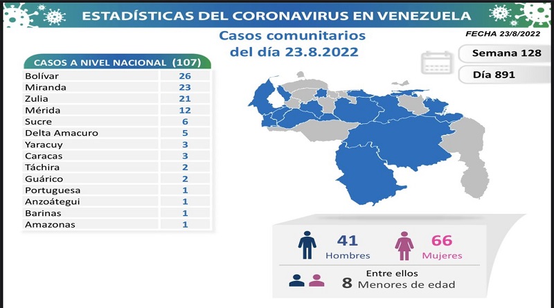 Detalló que los casos comunitarios están ubicados en los estados: Bolívar (26), Miranda (23), Zulia (21) y Mérida (12), entre otros que se describen a continuación: