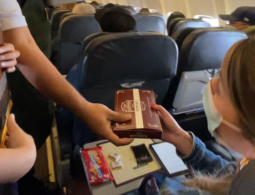 para completar esta extraordinaria experiencia se le brindó a los pasajeros una porción del Chocolate 20/20, elaborado con un 71% de cacao originario de Patanemo y cultivado en sus montañas, el cual es fermentado durante 6 días en cajones de madera de apamate, y posteriormente secado al sol, destacando sus notas a frutos rojos y especies como la canela.