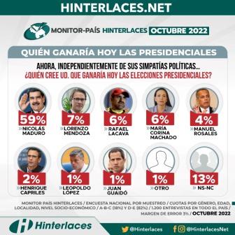 País.- El presidente de Venezuela, Nicolás Maduro, ganaría las elecciones presidenciales si se realizará este 28 de octubre, con el 59 % de los sufragios, según una reciente consulta popular llevada a cabo por la encuestadora Hinterlaces.