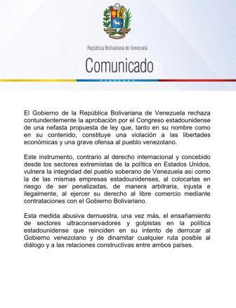 "Este instrumento (...) vulnera la integridad del pueblo soberano de Venezuela, así como la de las mismas empresas estadounidenses, al colocarlas en riesgo de ser penalizadas, de manera arbitraria, injusta e ilegal, al ejercer su derecho al libre comercio mediante contrataciones con el Gobierno bolivariano", dijo.