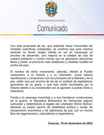 A través de un comunicado, rechazó la aprobación de la "nefasta propuesta de ley que, tanto en su nombre como en su contenido, constituye una violación a las libertades económicas y una grave ofensa al pueblo venezolano".