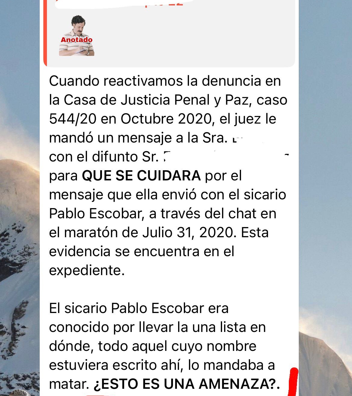 Una usuaria identificada como Alejandra Pérez publicó el caso en la noche del miércoles. “Denunciaron a un vecino porque usó un sticker en el grupo del edificio”, indicó, agregando una imagen del actor Andrés Parra representando al narcotraficante.
