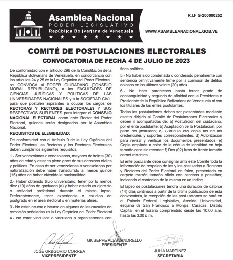 País.- Este martes, el Comité de Postulaciones Electorales anunció su convocatoria al Poder Ciudadano, a las facultades de Ciencias Jurídicas y Políticas y a la Sociedad Civil, para las postulaciones a rectores principales y suplentes del Consejo Nacional Electoral (CNE), la cual culminará el próximo martes 18 de julio.