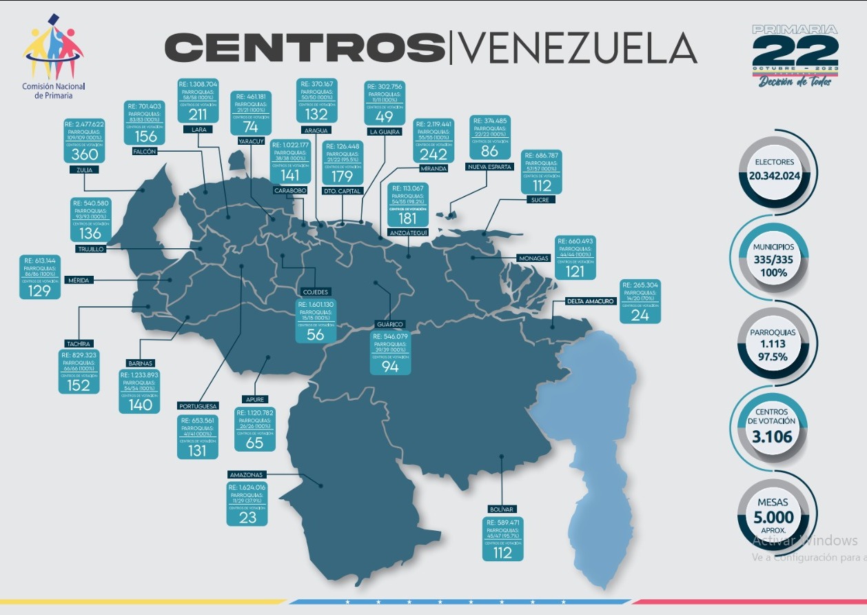 País.- La Comisión Nacional de Primaria (CNP) espera habilitar 3.106 centros de votación en 1.113 parroquias del país para la elección del próximo 22 de octubre, en la que se elegirá al abanderado opositor que se enfrente al oficialismo en 2024, así lo dieron a conocer este lunes.