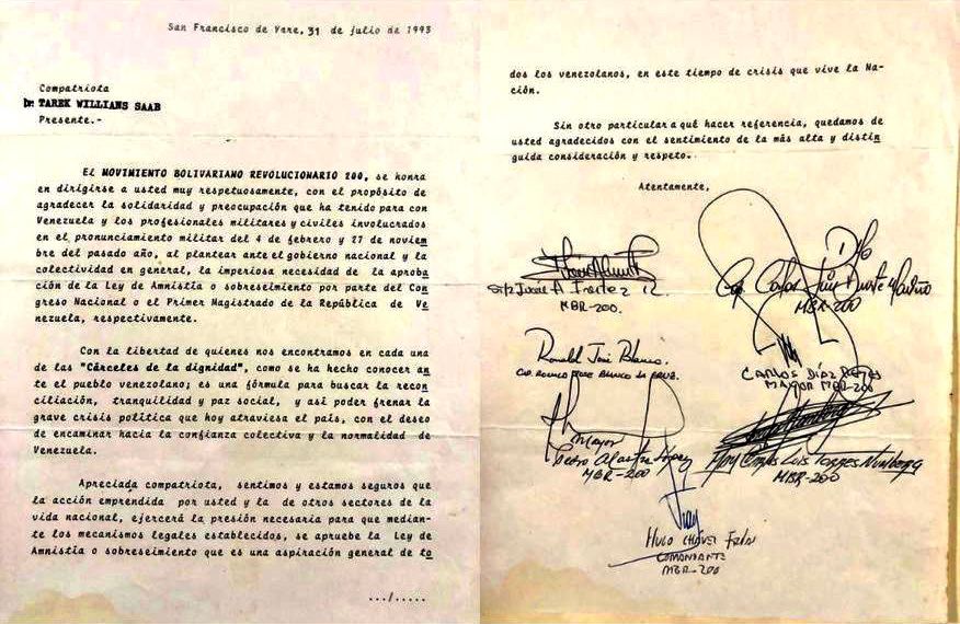 De esa categoría de hombres es Chávez y Tarek ...Este honroso documento escrito por los Rebeldes del 4 de Febrero del 27 de noviembre, como carta a Tarek desde la Cárcel de Yare, es una prueba más que se acumula al incesante trajinar del poeta tigrense en defensa de los Derechos Humanos (ejerciéndola con decidida entereza en aquellos tiempos tenebrosos en que se jugaba la vida y la Libertad).