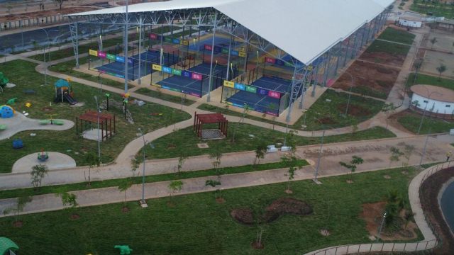 El área deportiva contará con canchas techadas de más de cuatro mil metros cuadrados, tiene tres canchas de pádel muy bien protegidas, son nueve canchas en total y en las afueras dos canchas de arena para fútbol y voleibol de playa.