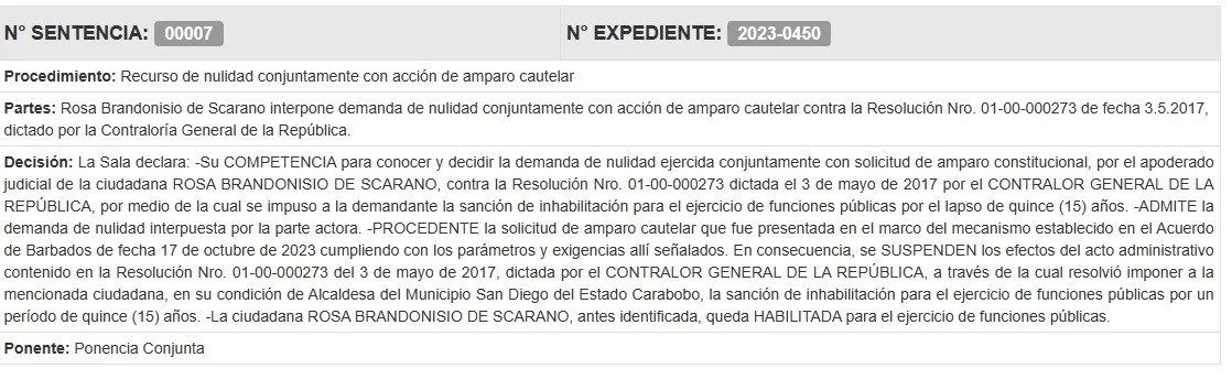 El máximo tribunal venezolano informó que Brandonisio de Scarano "queda habilitada para el ejercicio de funciones públicas", mediante la sentencia número 00007, publicada en la página oficial del poder judicial.