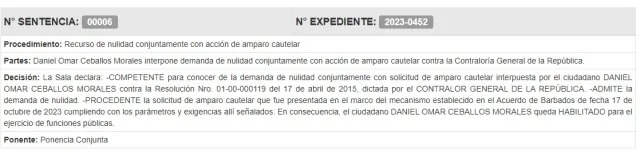 El TSJ detalló mediante la sentencia el recurso de nulidad conjuntamente con acción de amparo cautelar que fue interpuesto por Daniel Ceballos por las presuntas actuaciones materiales ejercidas por la Contraloría General de la República en abril de 2015.