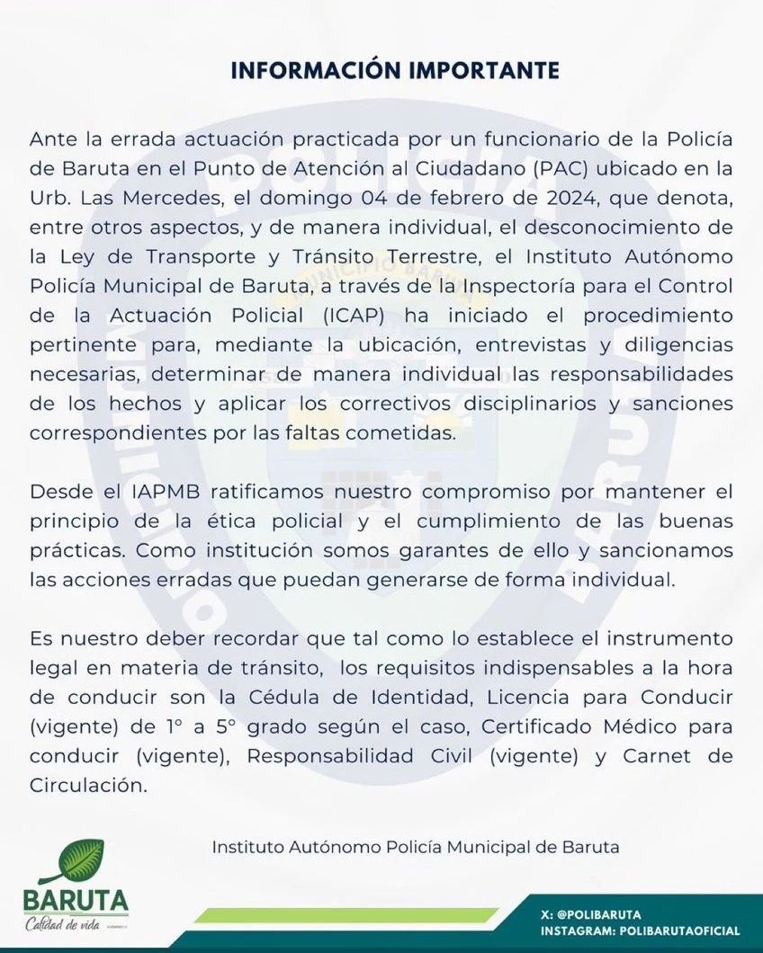 En el comunicado, en ente informó que sobre los hechos viralizados el pasado 4 de febrero en redes sociales, donde se observa a un Polibaruta solicitándole un permiso inexistente para circular con moto de alta cilindrada en la urbanización Las Mercedes, en Caracas, se iniciaron investigaciones.