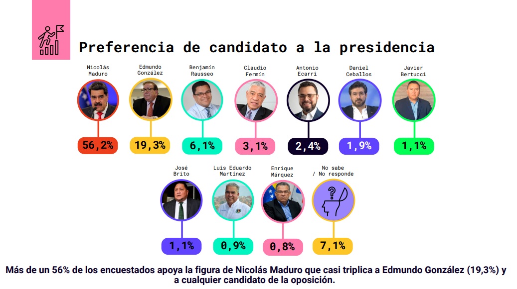 González es seguido por Benjamín Rausseo (6.1%), Claudio Fermín (3,1%), Antonio Ecarri (2,4%), Daniel Ceballos (1,9%), Javier Bertucci (1,1%), José Brito (1,1%), Luis Eduardo Martínez (0.9%) y Enrique Márquez (0,8%).