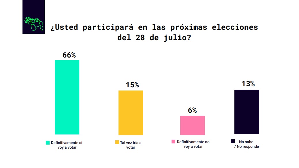 Al ser consultados sobre la intención de participar en las elecciones presidenciales del próximo 28 de julio, 66% afirmó que “definitivamente sí iría a votar”, 15% contestó que “tal vez” lo haría, 6% está convencido de no hacerlo y 13% aún no sabe o prefiere no contestar.