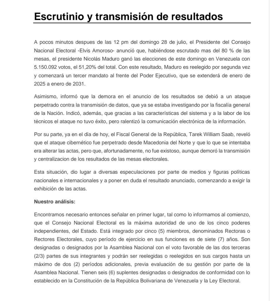 País.- La Asociación Americana de Juristas, Asociación Argentina de Juristas, Comisión chilena de Derechos Humanos, Federaciòn Judicial Argentina, Instituto Espacio por la Memoria, Organización de Movimiento Independentista Nacional Hostyosiano-PR; junto a otras organizaciones y personalidades presentaron el Informe Preliminar Conjunto Elecciones Presidenciales en Venezuela 2024 este 31 de julio.