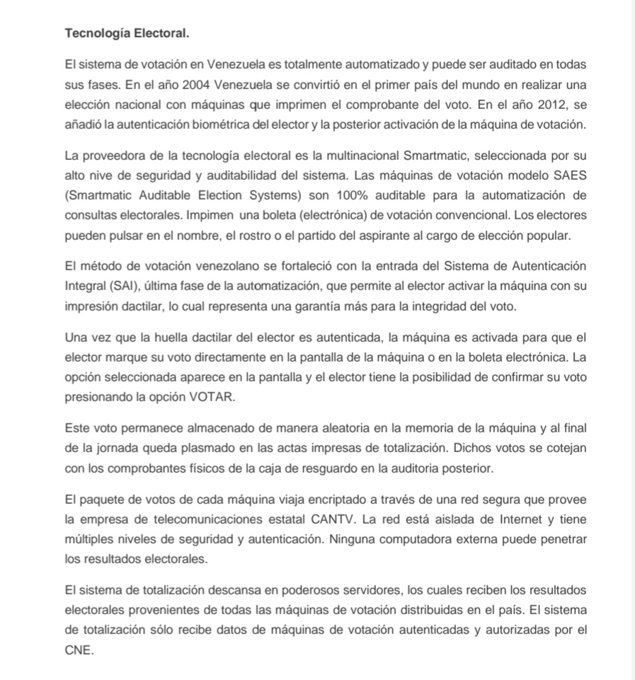 Asimismo aclara que el sistema de votación en Venezuela es totalmente automatizado y puede ser auditado en todas sus fases. "El paquete de votos de cada máquina viaja encriptado a través de una red segura que provee la empresa de telecomunicaciones estatal CANTV. La red está aislada de Internet y tiene múltiples niveles de seguridad y autenticación. Ninguna computadora externa puede penetrar los resultados electorales", explica.
