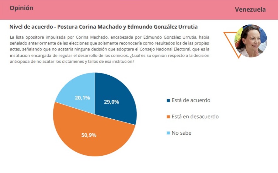 En cuanto al accionar de la oposición, 50,9% de los encuestados rechaza que el sector opositor impulsado por María Corina Machado y encabezada por Edmundo González haya tomado la decisión anticipada de no acatar los dictámenes y fallos del CNE, mientras que 29% está de acuerdo y 20,1% no sabe.