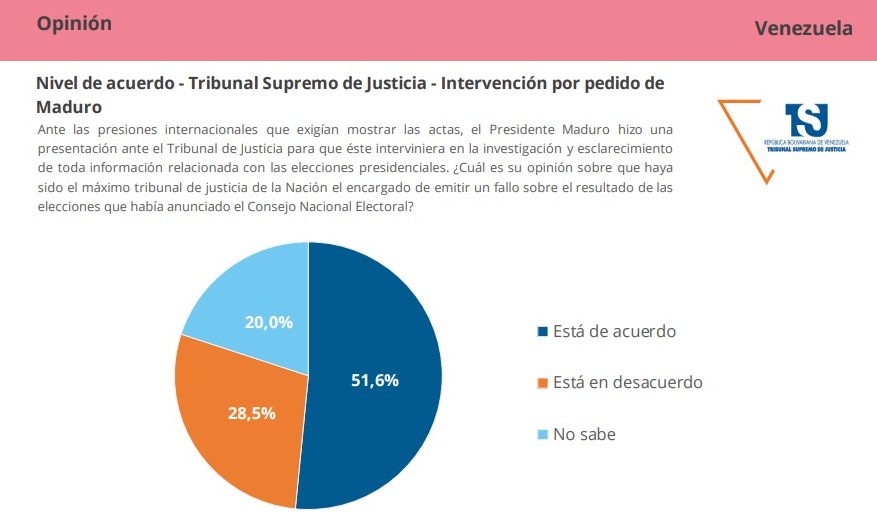 Más allá del resultado del peritaje, 51,6 % considera correcto que el presidente Maduro haya acudido al máximo tribunal de justicia para que éste interviniera en el esclarecimiento de toda información relacionada con las elecciones presidenciales.