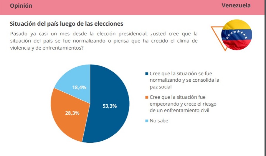 Sobre el clima del país luego de las elecciones, el 53,3% cree que la situación se fue normalizando y hoy se consolida la paz social frente a 28,3% que considera que la situación fue empeorando y crece el riesgo de un enfrentamiento civil y un 18,4% que no sabe.