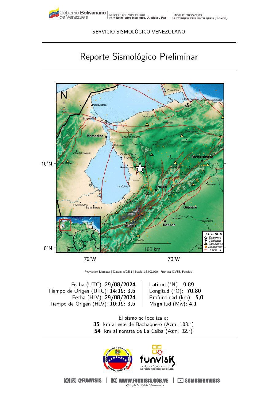 País.- La Fundación Venezolana de Investigaciones Sismológicas (Funvisis) reportó la mañana de este jueves 29 de agosto, un sismo de magnitud 4.1 en los estados Zulia y Trujillo.