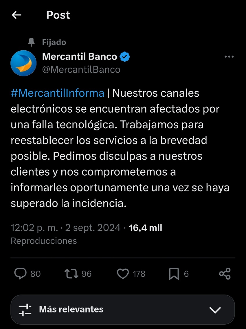 País.- El banco Mercantil reveló en un comunicado que está presentando fallas en su plataforma este lunes 2 de septiembre del 2024, esto no permite el ingreso de los usuarios a su cuenta bancaria desde la aplicación móvil y página web.