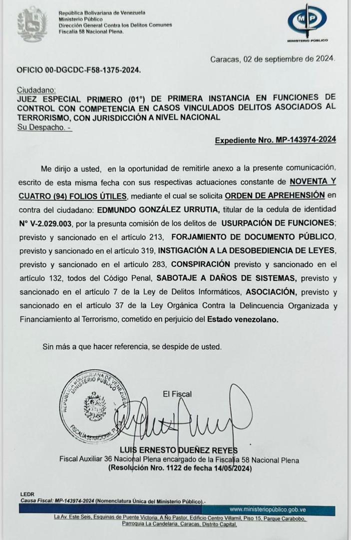País.- El Ministerio Público (MP) solicitó orden de aprehensión contra Edmundo González Urrutia por la presunta comisión de los delitos de usurpación de funciones, forjamiento de documento público, instigación a la desobediencia de leyes, conspiración, sabotaje a daños de sistemas según la ley de delitos informáticos y asociación.