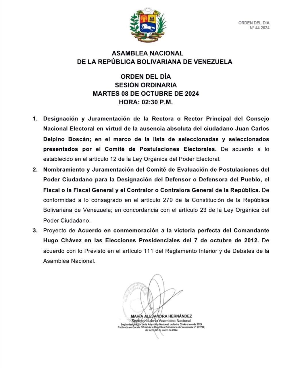 Durante la sesión a desarrollarse en horas de la tarde, se espera el nombramiento y la juramentación del Comité de Evaluación de Postulaciones del Poder Ciudadano para la designación del Defensor o Defensora del Pueblo, el Fiscal o la Fiscal General. También del Contralor o Contralora General de la República.