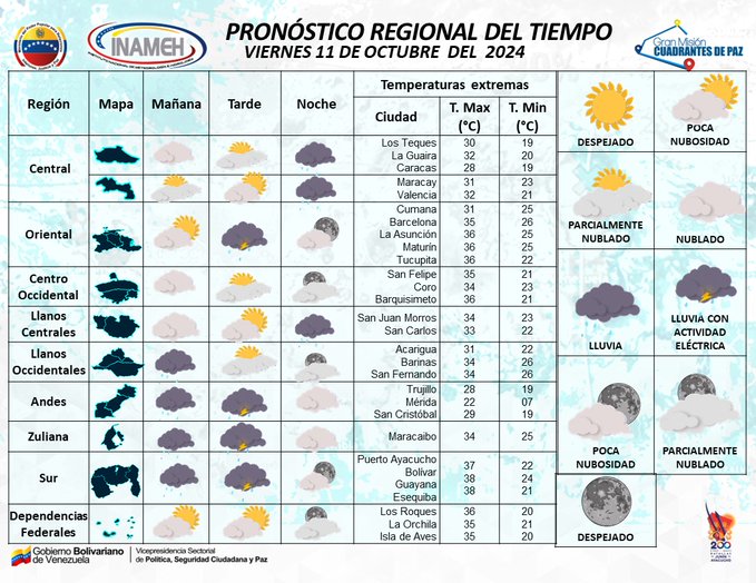 En horas de la tarde la tarde y noche se esperan lluvias y descargas eléctricas, especialmente en Amazonas, Bolívar, Guayana Esequiba, Delta Amacuro, este de Sucre, Falcón, Andes y Zulia. Asimismo, no se descartan algunos chubascos en Miranda, La Guaira, Distrito Capital, Aragua, Carabobo y Guárico