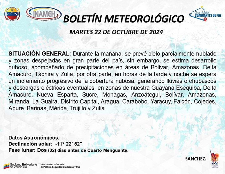 De acuerdo a la información compartida por Inameh, en horas de la tarde y noche se espera un incremento progresivo de la cobertura nubosa, generando lluvias y descargas eléctricas eventuales, en zonas de Guayana Esequiba, Delta Amacuro, Nueva Esparta, Sucre, Monagas, Anzoátegui, Bolívar, Amazonas, Miranda, La Guaira, Distrito Capital, Aragua, Carabobo, Yaracuy, Falcón, Cojedes, Apure, Barinas, Mérida, Trujillo y Zulia.