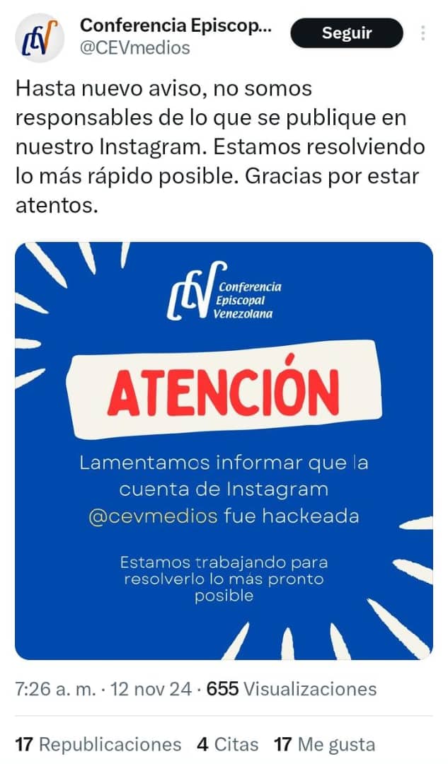País.- La Conferencia de Episcopal Venezolana (CEV), ha informado a través de un comunicado difundio por la red social X, que este martes 12 de noviembre su cuenta oficial en Instagram sufridó un hackeo.