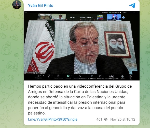 "Hemos participado en una videoconferencia del Grupo de Amigos en Defensa de la Carta de las Naciones Unidas, donde se abordó la situación en Palestina y la urgente necesidad de intensificar la presión internacional para poner fin al genocidio y dar voz a la causa del pueblo palestino", cita el mensaje que acompaña a la publicación realizada en su canal de Telegram.