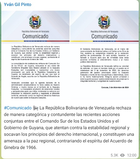 En un comunicado publicado por el canciller de la República, Yván Gil, a través de sus redes sociales, el Gobierno nacional asegura que la consolidación de las instalaciones militares del Comando Sur de los EE. UU. en Guyana "es inaceptable y representa una nueva provocación por parte de la República Cooperativa de Guyana, en detrimento del espíritu de paz que rigió el Acuerdo de Argyle suscrito en Venezuela".