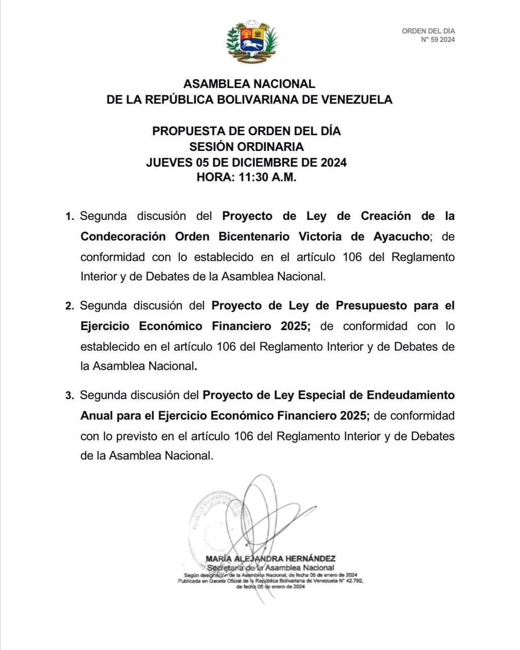 La sesión del parlamento iniciará a las 11:30 de la mañana en la sede del Palacio Legislativo Federal, para también discutir el proyecto de Ley de Creación de la Condecoración Orden Bicentenario Victoria de Ayacucho en el marco del aniversario de la Batalla de Ayacucho (1824).
