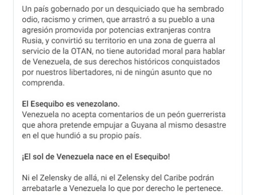 Finalmente, el canciller reafirmó: “¡El sol de Venezuela nace en el Esequibo! Ni el Zelensky de allá, ni el Zelensky del Caribe podrán arrebatarle a Venezuela lo que por derecho le pertenece”.