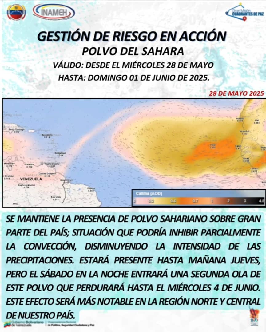 Asimismo, Inameh informó que se mantiene la presencia de polvo sahariano sobre gran parte del país, "situación que podría inhibir parcialmente la convección, disminuyendo la intensidad de las precipitaciones, estará presente hasta mañana jueves pero el sábado en la noche entrará una segunda ola de este polvo que perdurará hasta el 4 de junio".