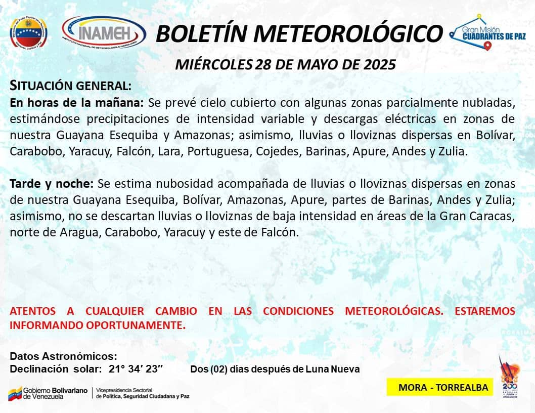 País.- El Instituto Nacional de Meteorología e Hidrología (Inameh) prevé para este miércoles 28 de mayo, cielo cubierto con algunas zonas parcialmente nubladas, estimándose precipitaciones de intensidad variable y descargas eléctricas en zonas de Guayana Esequiba y Amazonas; asimismo, lluvias dispersas en Bolívar, Carabobo, Yaracuy, Falcón, Lara, Portuguesa, Cojedes, Barinas, Apure, Andes y Zulia.
